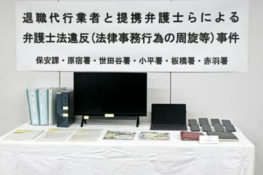 関係先から押収されたスマートフォンなど=5日午前、警視庁原宿署