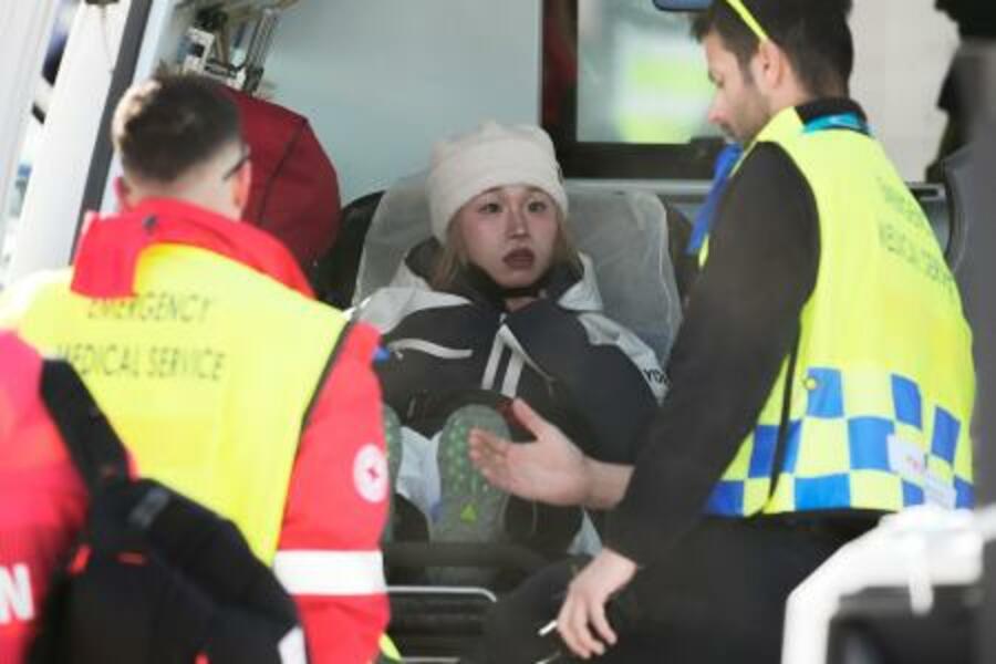 公式練習中に転倒し、救急車に運ばれたフリースタイルスキー女子スロープスタイルの近藤心音(中央)=リビーニョ(共同)