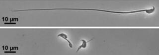 マウスの精子の顕微鏡画像。タンパク質「CFAP91」を作る遺伝子を欠損させた精子(下)は、べん毛の形成がうまくいかず泳げなくなった