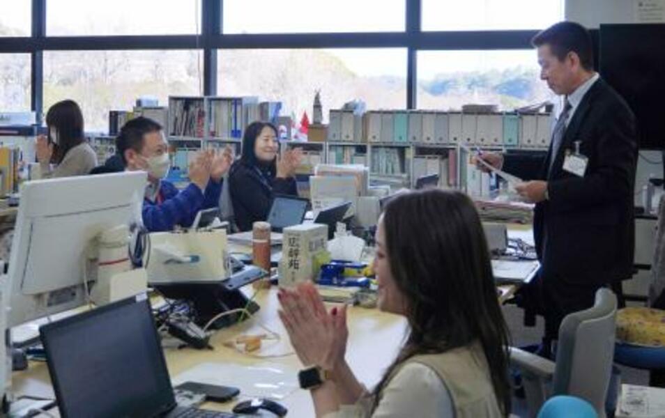 ギョーザ購入額が3年連続の日本一となり、喜ぶ浜松市の職員ら=6日午前、浜松市役所