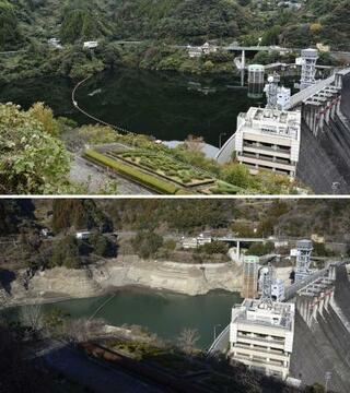 貯水率100%(上、2025年11月)と今月4日、貯水率が低下した大渡ダム=高知県仁淀川町(大渡ダム管理所提供)