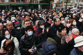 雪が舞う中、街頭演説に集まった有権者=7日午後、東京都内(政党ビラにモザイク加工しています)