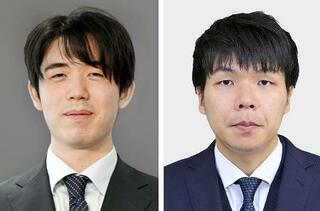 第51期棋王戦コナミグループ杯5番勝負第1局で、増田康宏八段(右)と対局する藤井聡太棋王=8日午前、松山市