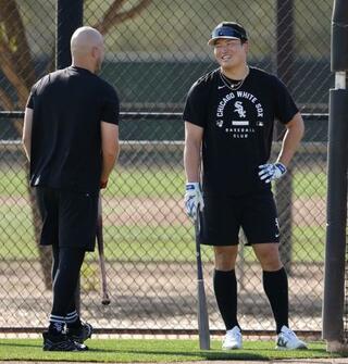 練習の合間に談笑するホワイトソックス・村上=グレンデール(共同)