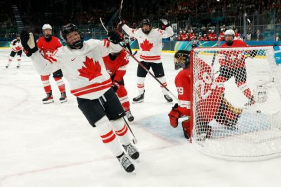 アイスホッケー女子1次リーグのスイス戦でゴールを喜ぶカナダの選手たち=7日、ミラノ(ロイター=共同)