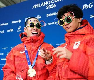 男子ビッグエアで金メダルを獲得し、おどける木村葵来(左)と銀メダルの木俣椋真=リビーニョ(共同)