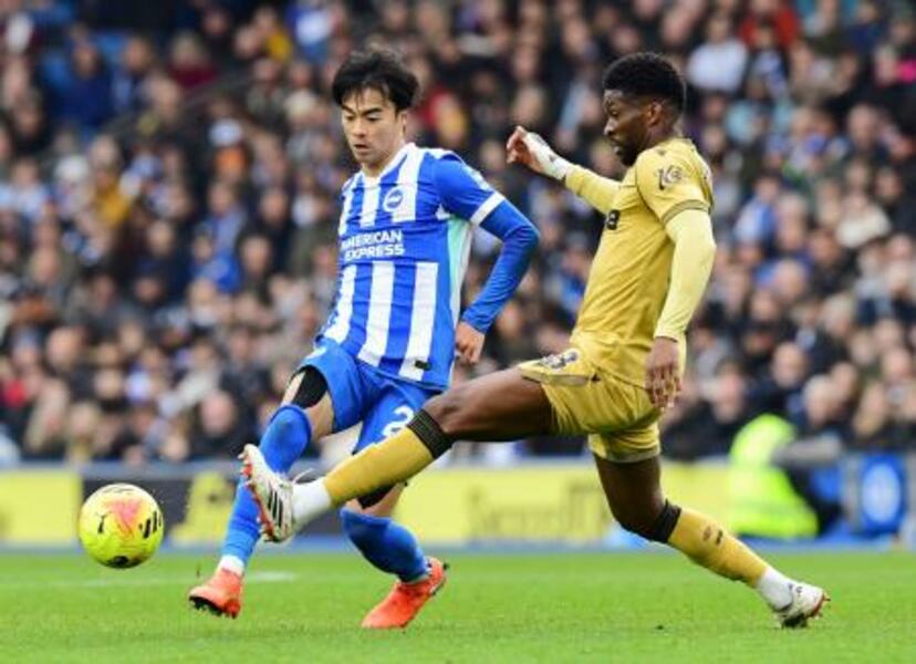 クリスタルパレス戦で競り合うブライトンの三笘(左)=ブライトン(共同)