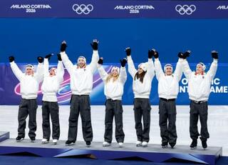 フィギュアスケートの団体で銅メダルを獲得したイタリアチーム=8日、ミラノ(共同)