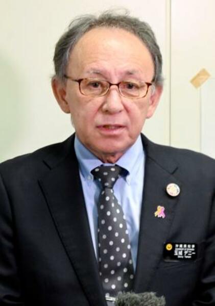 記者団の取材に応じる沖縄県の玉城デニー知事=9日午前、沖縄県庁