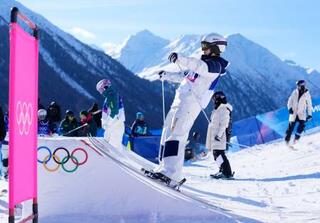 男子モーグルの公式練習で調整する堀島行真(手前)=リビーニョ(共同)