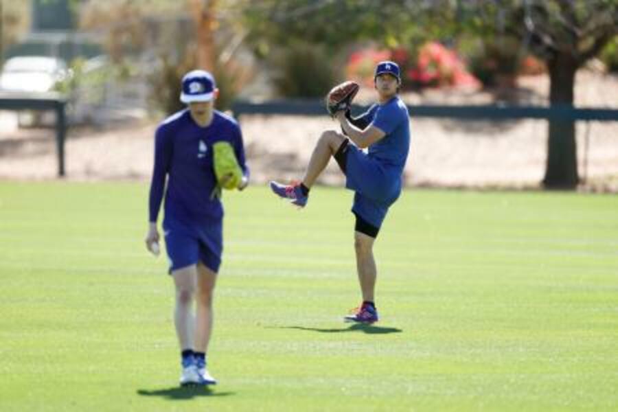 キャッチボールするドジャース・大谷。左は佐々木=グレンデール(共同)