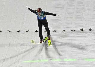 混合団体 2回目の飛躍を終えた小林陵侑=プレダッツォ(共同)