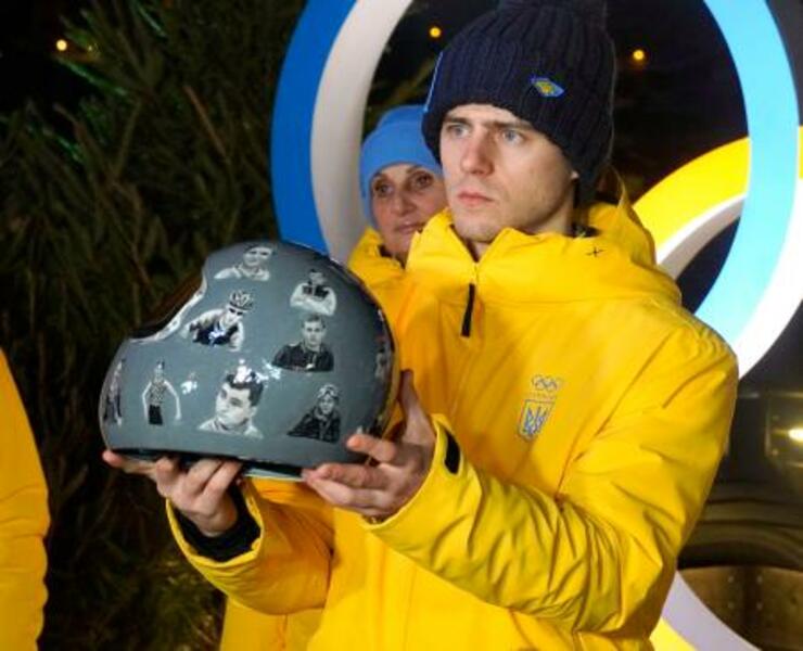 ロシアの攻撃で犠牲となったアスリートたちの顔写真を張ったヘルメットを手にするスケルトン男子ウクライナ代表のウラジスラフ・ヘラスケビッチ=10日、コルティナダンペッツォ(共同)