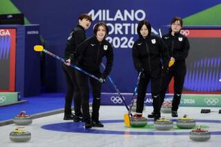 試合会場で調整する(左から)小谷、吉村、船山コーチ、小笠原コーチ=コルティナダンペッツォ(共同)