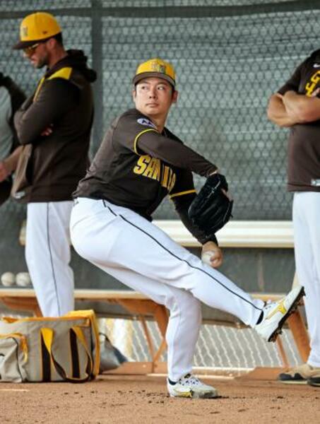 ブルペンで投球練習するパドレス・松井=ピオリア(共同)