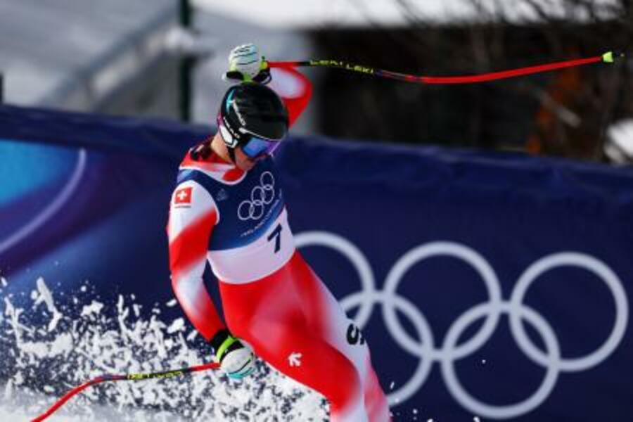 男子スーパー大回転、ゴール後に腕を突き上げるフラニョ・フォンアルメン=11日、ボルミオ(ロイター=共同)