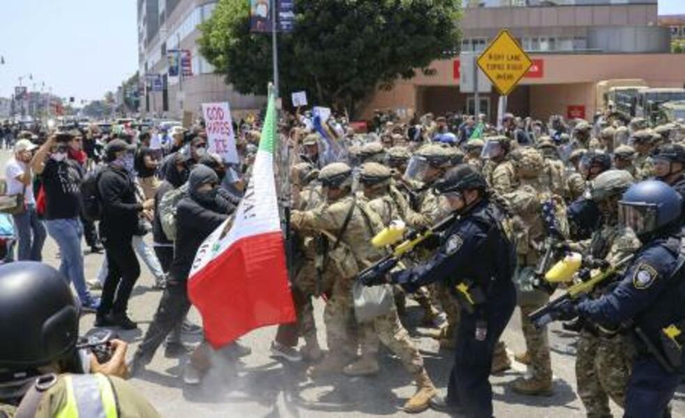 2025年6月、米ロサンゼルスの連邦施設付近で衝突する州兵と移民摘発の抗議者ら(共同)