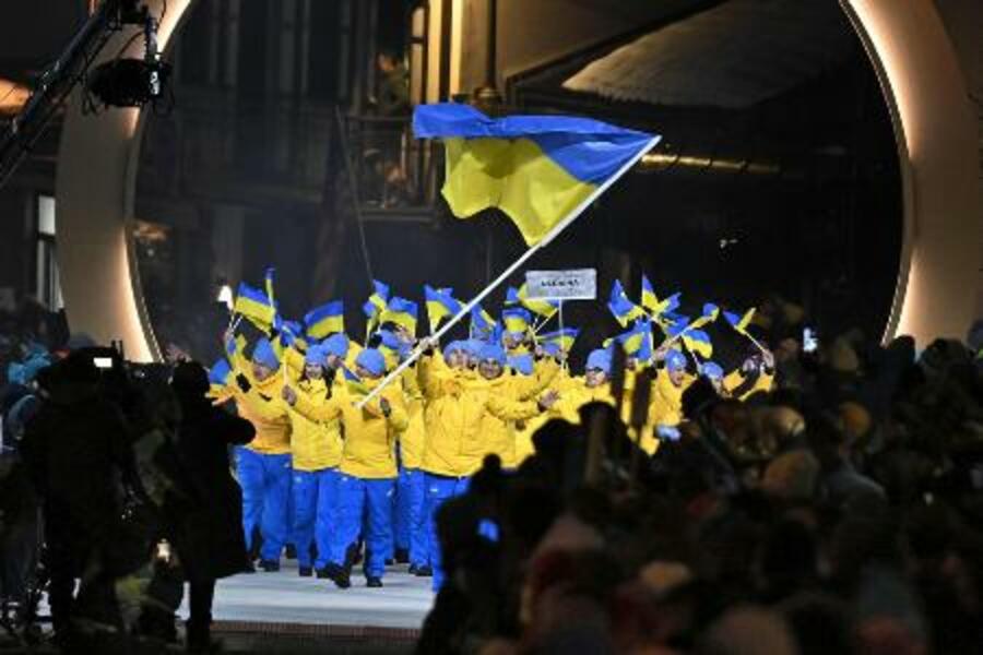 ミラノ・コルティナ冬季五輪の開会式で、入場行進するウクライナ選手団=6日、イタリア・コルティナダンペッツォ