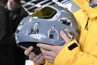 戦死した母国のアスリートたちの顔が描かれたスケルトン男子ウクライナ代表のウラジスラフ・ヘラスケビッチのヘルメット=12日、イタリア・コルティナダンペッツォ(共同)