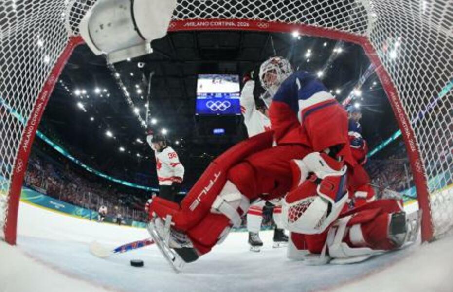アイスホッケー男子1次リーグ、チェコ戦でゴールを決めるカナダのニック・スズキ(中央左奥)=12日、ミラノ(ロイター=共同)
