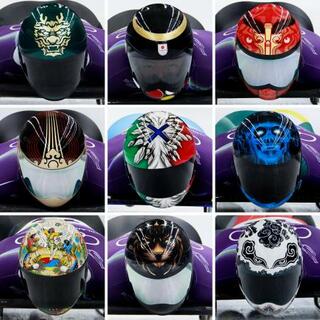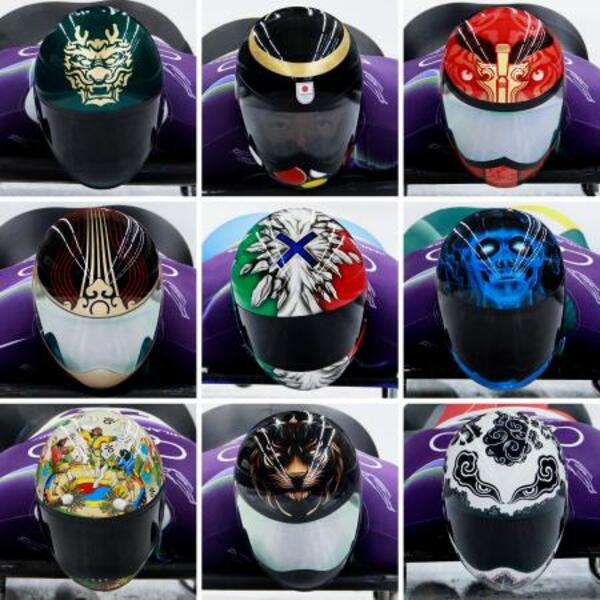 スケルトンの色鮮やかな個性あふれるヘルメット=13日、コルティナダンペッツォ(共同)