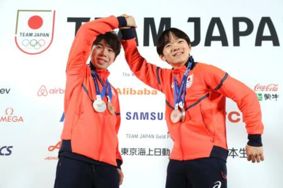 獲得したメダルを胸に撮影に応じるフィギュアスケート男子の鍵山優真(右)と佐藤駿=14日、イタリア・ミラノ(共同)