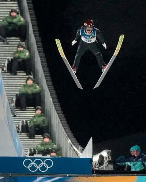 男子個人ラージヒルで銀メダルを獲得した二階堂蓮の1回目の飛躍=プレダッツォ(共同)