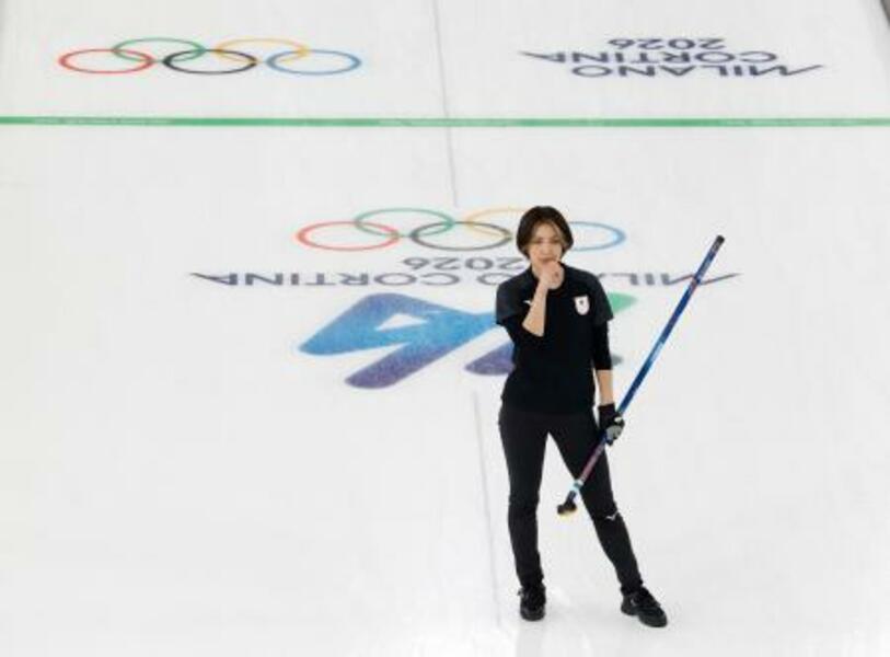 日本―米国 第8エンドの最終ショット後、厳しい表情を見せる吉村。3点を奪われた=コルティナダンペッツォ(共同)