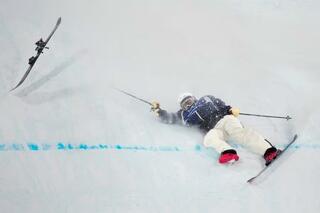 女子ビッグエア予選 転倒する古賀結那=リビーニョ(共同)