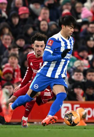 リバプール戦で攻め込むブライトンの三笘(手前)=リバプール(共同)
