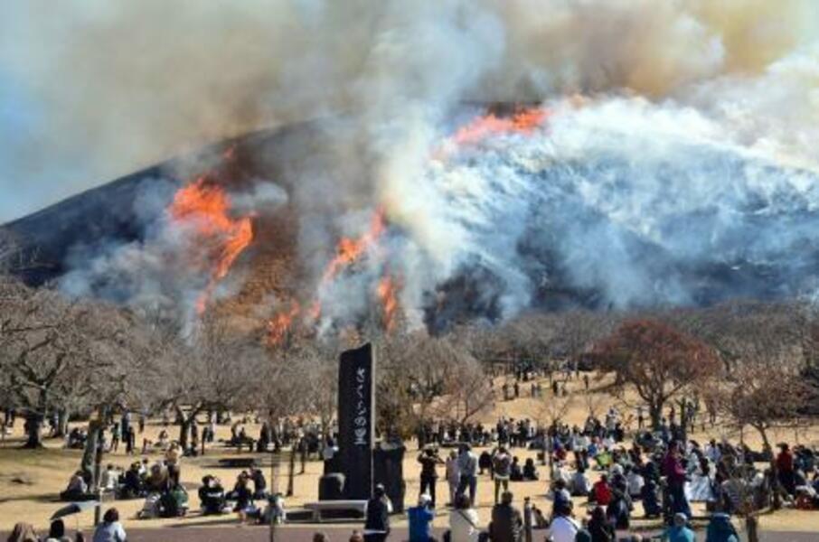 静岡県伊東市の大室山で行われた、春の訪れを告げる山焼き=15日