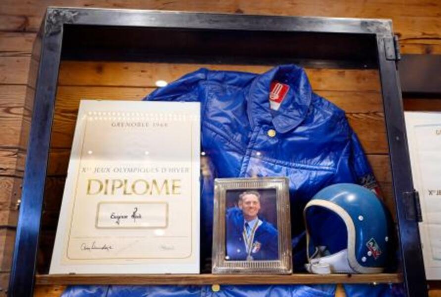 エウジェニオ・モンティのヘルメットなどが飾られたショーケース=6日、イタリア・コルティナダンペッツォ(共同)
