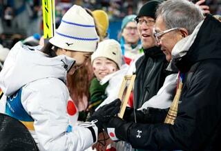 女子個人ラージヒルを終え、母信子さんの写真に触れる丸山希。右は父守さん=プレダッツォ(共同)