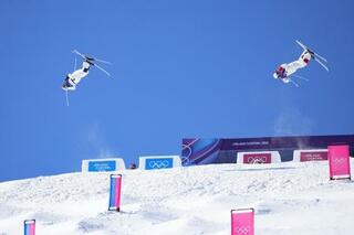 フリースタイルスキー男子デュアルモーグル決勝で第1エアを決める堀島行真(左)=リビーニョ(共同)