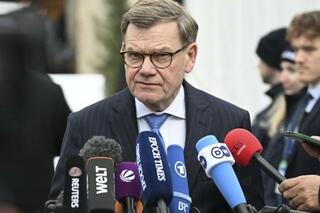 13日、ドイツ・ミュンヘンで、記者団の取材に応じるワーデフール外相(ゲッティ=共同)