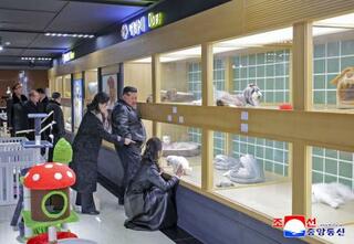 平壌の和盛地区でペットショップを視察する北朝鮮の金正恩朝鮮労働党総書記(中央)と妻子=16日(朝鮮中央通信=共同)