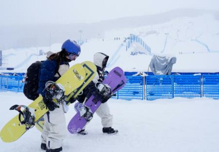 女子スロープスタイル決勝が悪天候のため延期となり、引き揚げる深田茉莉(左)、岩渕麗楽=リビーニョ(共同)