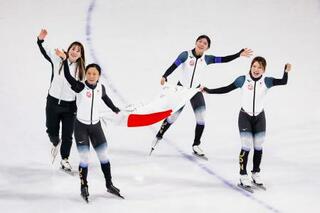 女子団体追い抜きで銅メダルを獲得し、日の丸を掲げ場内を回る(左から)堀川桃香、高木美帆、野明花菜、佐藤綾乃=ミラノ(共同)