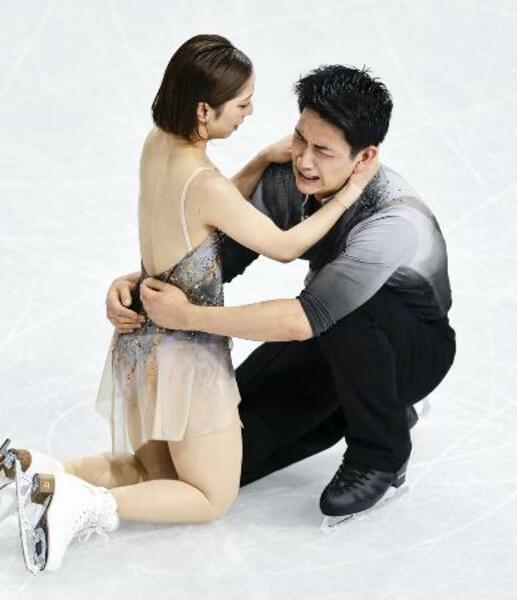 ペア・フリーの演技を終え感極まる三浦璃来(左)、木原龍一組=16日、ミラノ(共同)