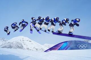 男子スロープスタイル決勝の2回目で滑走する長谷川帝勝の連続合成写真(右から左へ)。銀メダルを獲得した=リビーニョ(共同)