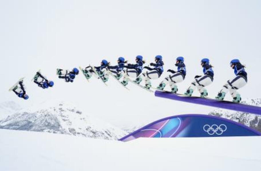 女子スロープスタイル決勝の2回目で技を繰り出す深田茉莉の連続合成写真(右から左へ)。金メダルを獲得した=リビーニョ(共同)