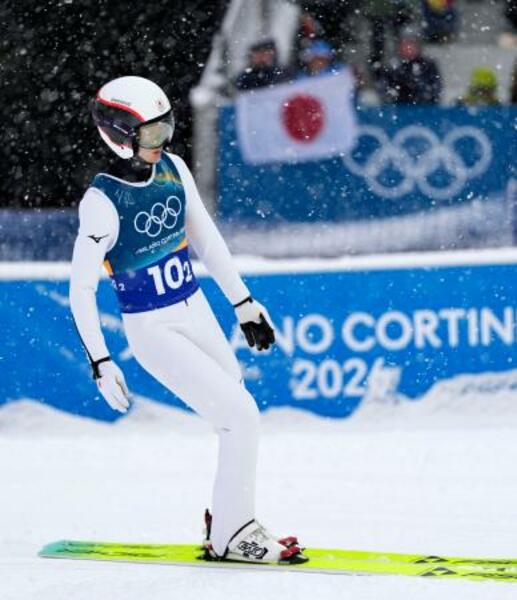 男子団体スプリント 前半飛躍を終えた山本涼太=プレダッツォ(共同)