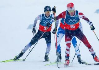 男子団体スプリント 後半距離で力走する渡部暁斗(左)=テーゼロ(共同)
