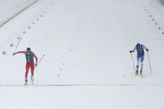 複合男子団体スプリントを制したノルウェーのJ・オフテブロ(左)=19日(ロイター=共同)