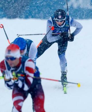 男子団体スプリント 後半距離で力走する山本涼太(奥)=テーゼロ(共同)