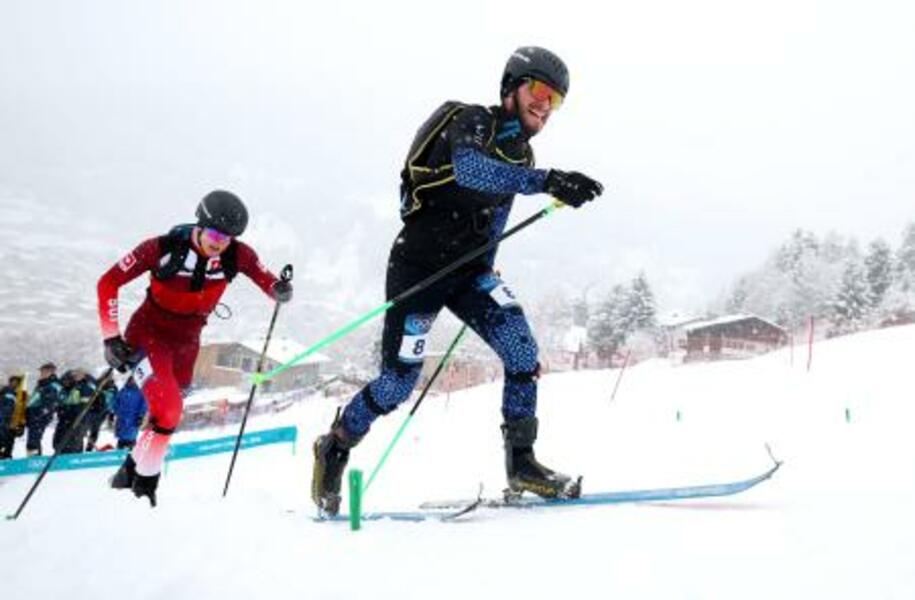 山岳スキー男子スプリントで銀メダルを獲得したAINのニキータ・フィリポフ(右)=19日、イタリア・ボルミオ(ゲッティ=共同)
