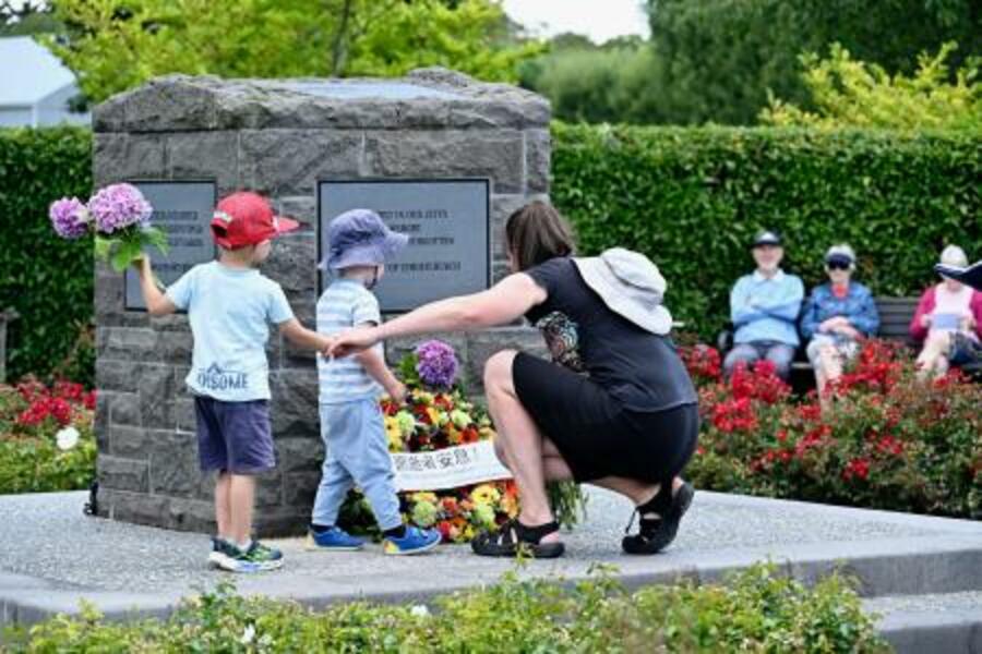 ニュージーランド地震の犠牲者をしのぶ追悼式で、花を手向ける人たち=20日、クライストチャーチ(共同)