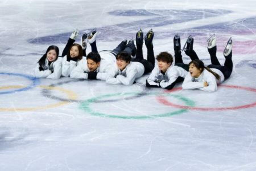 エキシビションの練習に参加し、記念撮影する(左から)中井亜美、三浦璃来、木原龍一、鍵山優真、佐藤駿、坂本花織=ミラノ(共同)