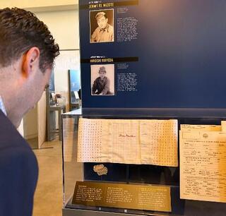 20日、米サンフランシスコで内覧会が開かれた日系人兵士の特別展で千人針を見る来場者(共同)