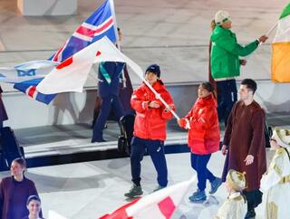 閉会式が行われた「ベローナ五輪アリーナ」の外に集まった各国の旗手=22日、イタリア・ベローナ(ロイター=共同)